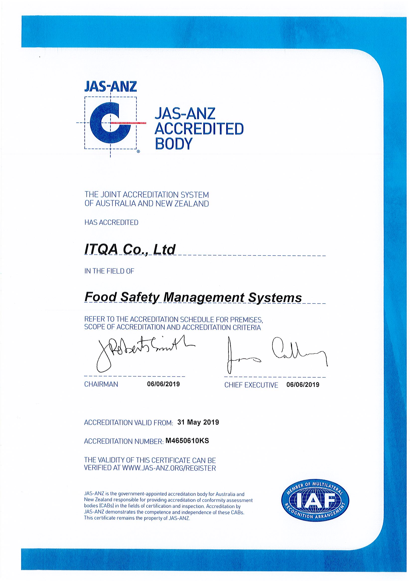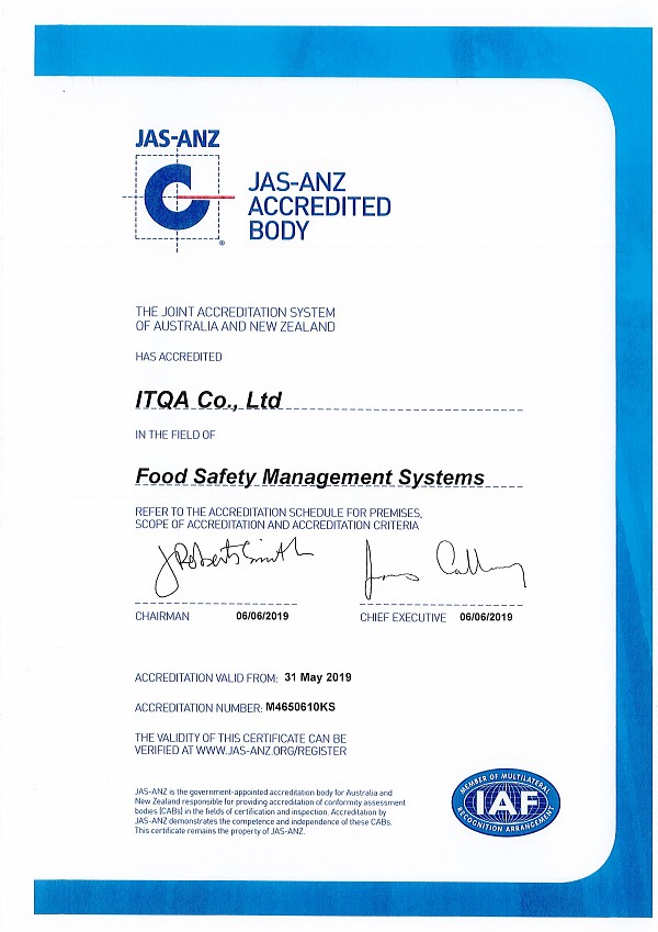 2019년 5월 31일부로 저희 NTREE 인증원이 JAS-ANZ로부터 ISO 22000(식품안전경영시스템) 인증기관으로 지정받았음을 안내드립니다.
